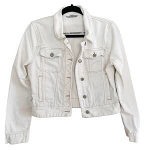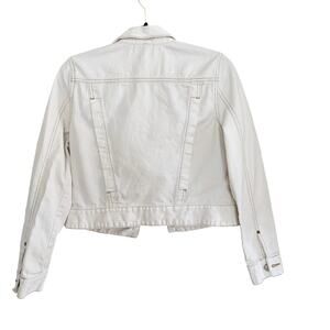 Cream/ivory denim jacket has contrast top stitch detail. Front flap pockets. Side seam pockets. Exposed button cuffs. 100% cotton. Size Small. NWOT. Retail = $98