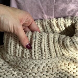Chunky knit design. Soft and warm. Ideal for layering. Slight stain on neckline