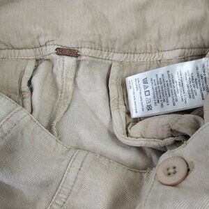 These are a light khaki color to darker cream color. There are no defects but they do wrinkle when folded for shipping. The fabric is a soft worn cotton look so there may be natural worn wear to them. I never wore them before they were too big for me and so I’m Reposhing them.