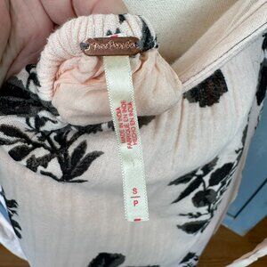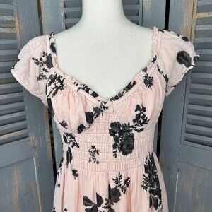 Elegant cream midi dress with black floral print. Features cap sleeves and a flattering silhouette. Perfect for any occasion.