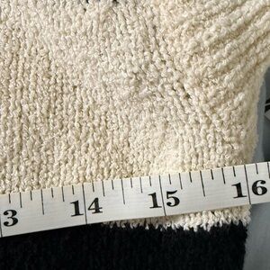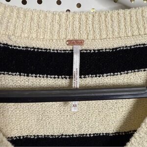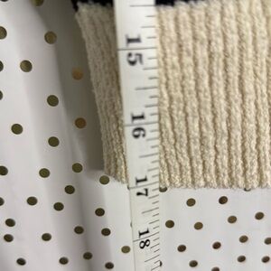 Stylish cream knit vest with bold black stripes. Features a V-neck design.