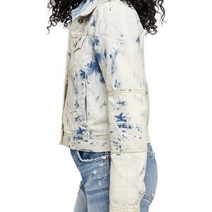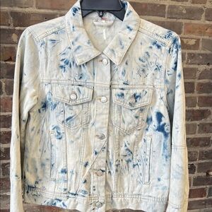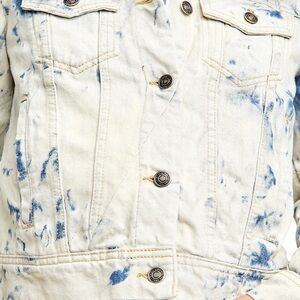 Chic cream denim jacket with blue tie-dye accents. Perfect for casual wear. Adds a stylish touch to any outfit.
