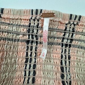 This charming sundress by Free People features a pleated design with a tie front detail, perfect for a casual day out or a night at the resort. The sleeveless mini dress comes in a sophisticated cream and brown color palette, with spaghetti straps adding a touch of elegance. Its playful and breezy style makes it an ideal choice for warm weather occasions.