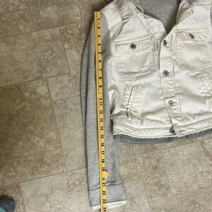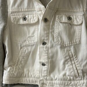 Stylish jean jacket with cream body and gray sleeves. Button front closure. Dual chest pockets.