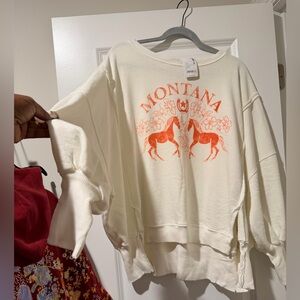 Cozy cream sweatshirt with orange horse graphic. Relaxed fit. Perfect for casual wear.