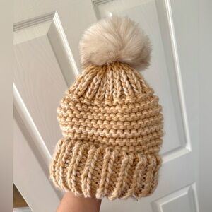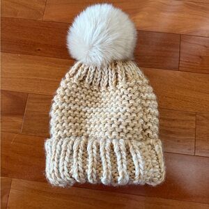 Free People Cream and Tan Fluffy Puff Ball Pom Chunky Knit Beanie