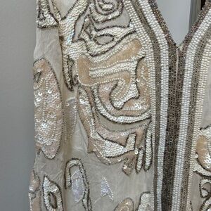 Chic camisole with intricate beadwork. Features cream and silver tones. Perfect for stylish layering. Slight discoloration along straps.