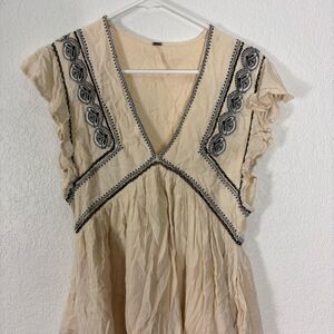 Free People Cream with Black Embroidery V Neck Blouse Top Size XS