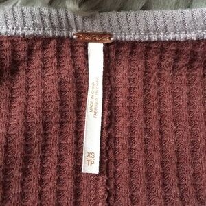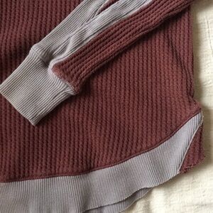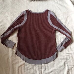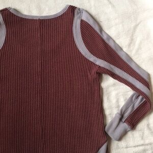Dusty purple thermal with grey contrasting rib fabric trim - 17.5” Underarm to Underarm - gently Worn, one small flaw as shown (picked thread) -size XS