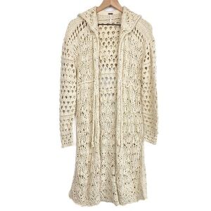 Free People Crochet Cardigan XS Cream Sweet Talker Coastal Longline Hooded Boho