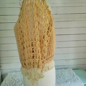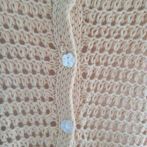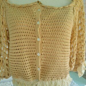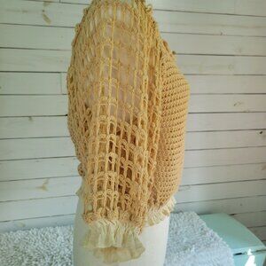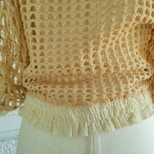 Free People loose crochet sweater to throw on over a camisole or tee. Its a lovely neutral beige color with feminine ruffles at the sleeves and waist.