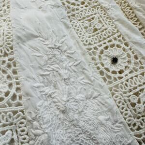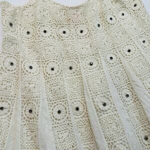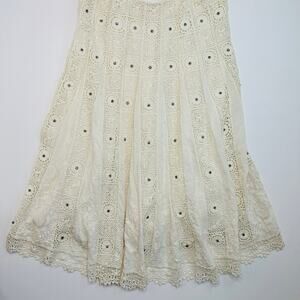 Free People Crochet and Embroidered Swing Dress with Rhinestones. Strappy fit to flare swing dress. Cream cotton/viscose blend. Fully lined. Very detailed embroidery and crochet, and this dress is fairly heavy. Rhinestones and sequin decoration. Adjustable straps. Womens size Small. Good used condition.