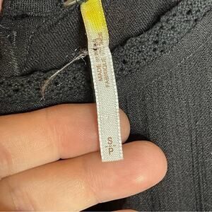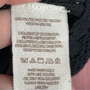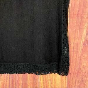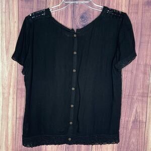 In Good Used Condition. Women's short sleeve, black shirt, needle point floral graphic at chest, crocheted sides, sleeve slit at hem & neck, brown wood buttons down back, scoop neckline.