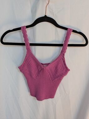 Fitted ribbed body with crochet detailed cups. Scalloped crochet straps. Soft knit fabric with stretch. Feminine cropped silhouette.