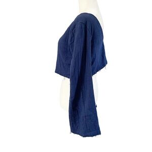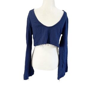 Free People Crop Top Long Sleeve Scoop Neck Shirt Raw Blue Hem Sz XS TP