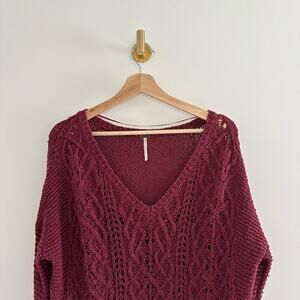 Details: Free People Cross My Heart Cable Knit V-Neck High Low Hem Sweater - Size: L- Color: Red- Material: 100% Cotton- Features: Cable-knit, V-neck, high low hem, raw hem, long sleeve, knit, raglan sleeve, hand wash, comfort, breathable, casual.