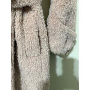 Features: Faux sherpa fabrication, oversized lapels, V neckline, double-breasted closure, button cuff sleeves, self-tie waist belt