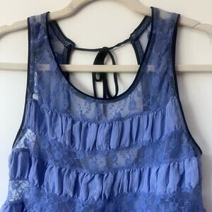 Babydoll style with a paneled bust, open back, and contrast trim.
