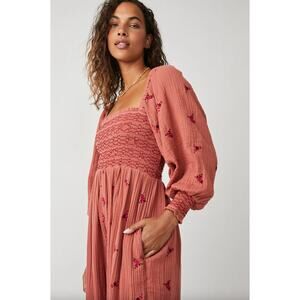 Free People Dahlia Jumpsuit Floral Wide Leg Smocked Pink Red XS Embroidery Boho