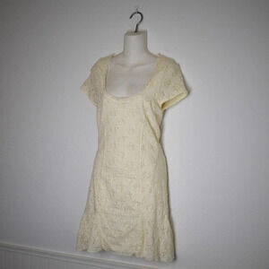 Pre-owned, good condition. No visible holes or stains. Normal signs of wear such as light pilling. Neutral shade of ivory daisy floral lace fabric. Scoop neckline and back. Mini length. Short, cap sleeves. Lined with sheer sleeves and upper back. Stretchy. Size per tag: M (Medium). Fabric: Shell: 97% Nylon, 3% Spandex. Lining: 100% Rayon. Size per tag does not guarantee desired fit, please see pictures for measurements.