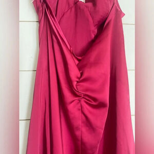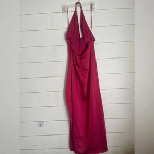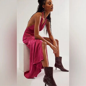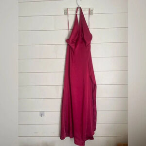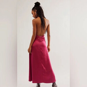 Forever timeless and made for every occasion, this midi is featured in a soft satin fabrication and sleek silhouette with a plunging V-neckline and slit at the leg. **Fit:** Slim-fitting silhouette, midi length **Features:** Soft satin fabrication, plunging V-neckline, flattering seaming throughout, exaggerated leg slit, halter-style with an open back, ruched back detail, lined **Why We