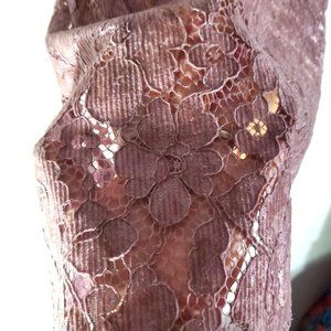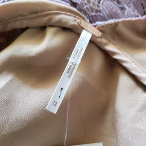 Delicate floral lace graces a flirtatious A-line dress designed with a thigh-grazing hemline and a plunging V-cut back. V-neck, Spaghetti straps, Slips on over head, hidden side zipper, Floral lace construction, Plunging back, Contrast lining (tan), light weight.
