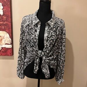 A mix of patterns invigorates a gauzy button-up shirt topped with a spread collar and finished with a curved hem. Machine wash, tumble dry.