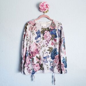 Simple ribbed top featuring unexpected details with sheer mesh and delicate floral embroidered shoulder accents. Side vents