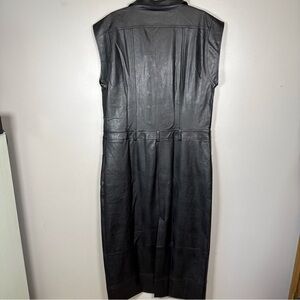 This stunning Free People Danni Vegan Leather Midi Dress in size XL is perfect for any occasion. The dress features a solid black color, a collared neckline, and a sleeveless design with a button closure. It's made from high-quality faux leather viscose material, which makes it comfortable to wear and machine washable for easy care.