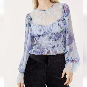 Free People, Daphne Blue Floral Lace Blouson Sleeve Smocked Blouse, SZ Large