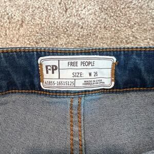 Stylish flare jeans by Free People. Dark blue denim. Frayed hem for a trendy look.