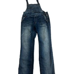 Stylish dark blue denim overalls. Features adjustable straps and front pockets. Perfect for casual wear.