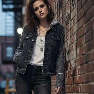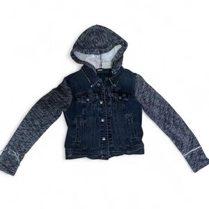 Stylish dark denim distressed jacket with cozy heathered gray sleeves and hood. Perfect for layering.