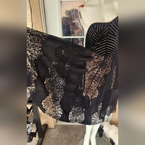 Stunning midi dress with an asymmetrical hem featuring a lacey design with a luxe velvet-adorned bodice.