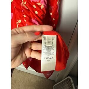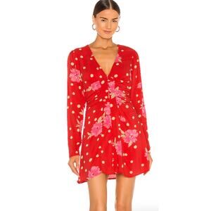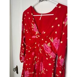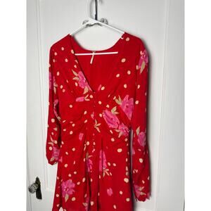 Excellent condition - no snags, holes, or stains. Red v-neck mini dress. Long sleeve style/ Red floral print allover. Viscose blend of fabric. Fully lined. Flattering ruched detailing. Smoke free pet friendly home. All offers are welcome.