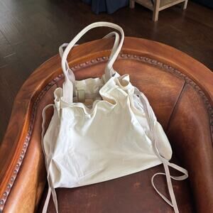 Features: Tote style, slouchy design, canvas fabrication, leather tie sides, top handles, cinched closure, interior zip pocket