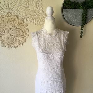 Free People Daydream Bodycon open back lace slip. Pretty and feminine lace slip dress in white from Free People. High neck with open cut out back and scalloped lace trim. Button closure at neck. Lined with sweetheart neckline. NWT. Size Small and Small available. Measurements are taken with the item lying flat and are as follows: