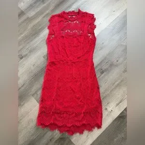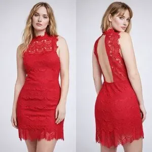 Gorgeous Cherry red lace “Daydream” dress from Free People. NEW with tag! Size large. Perfect for date night or a sexy outing. Dual button neck closure with a sexy open back. Fully lined with a solid red mini dress. Material: 60% cotton, 40% nylon. Lining: 100% rayon. Please see photo section for approximate flat measurements.
