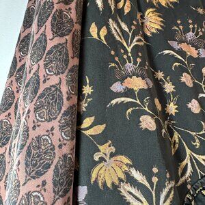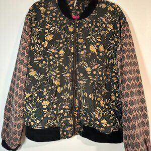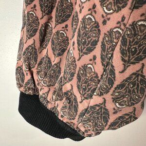 Free People bomber jacket. Zip front, 2 pockets with single snap closure. Oversize fit. Mid-weight, this is quilted on the inside body and lined on the inside sleeves. Cotton patterned fabric. Good condition, no damage. 22" across chest & shoulders, 24" sleeves