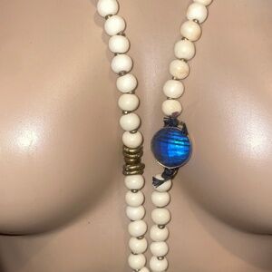 -American made long statement necklace featuring a bone beaded chain with different sized charm accents throughout. Standout colorful pendant a tassel and metal beads. Adjustable fit. *By De Petra