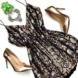 Free People Deco Sequin Mini Dress Black, Gold, White Geometric Beaded Size 8