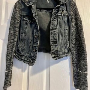 Free People denim jacket with sweatshirt material sleeves and matching removable hoodie.