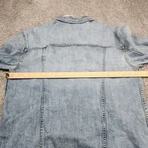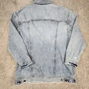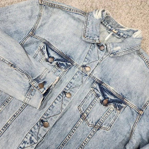Keywords: Free People, denim jacket, jean jacket, womens jacket, light wash, distressed, casual jacket, outerwear, M/L, medium large, button front, pockets, bohemian, contemporary, everyday, denim, oversized, light wash, distressed, shacket, urban, casual outerwear, layering piece, boho chic, street style, indie, relaxed fit, 90s inspired, grunge, everyday jacket