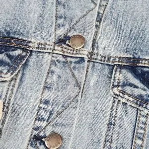 Stylish denim jacket by Free People. Features a light wash and distressed detailing for a casual, lived-in look. This jacket includes a classic button-down front, chest pockets, and side pockets, offering both style and functionality. The denim material provides durability and comfort, making it suitable for everyday wear. Perfect for layering over a simple tee or dress, this jacket adds a touch of effortless cool to any outfit. Ideal for weekend outings, casual gatherings, or adding an edgy touch to your everyday style.