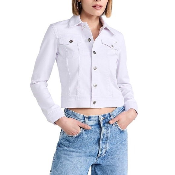 Stylish denim trucker jacket in a soft lilac purple wash. This classic wardrobe staple features a button-down front, chest pockets with button closures, and a tailored silhouette that flatters the figure.