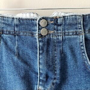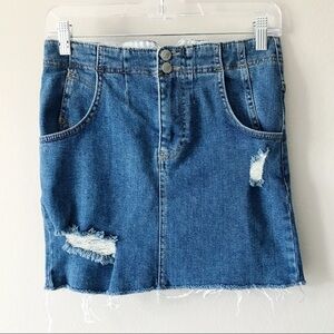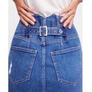Free People denim blue jean mini skirt in size 2. Factory distressing and raw hem. Adjustable buckle at back. Zipper fly. Functional pockets. Cotton/elastane. Machine washable. Pre-owned, excellent used condition.