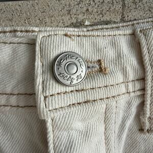 Free People We The Free denim skirt in a cream off-white wash. Women’s size 27. Rigid 100% cotton denim in a high-rise, midi pencil silhouette with 5-pocket styling, button-zip closure, side front slit, and raw hem. A minimalist take on the denim skirt trend, easy to style for casual everyday or elevated streetwear edits.