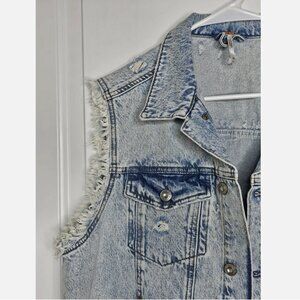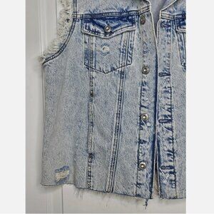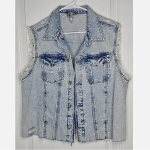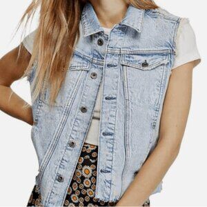 Chic denim vest with button closure. Sleeveless and versatile. Ideal for layering.