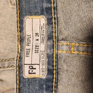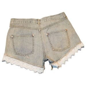 Free People Denim and Lace Overwash Distressed Shorts Size 26, button and zipper closure, 5 pockets, in good pre-owed condition.
