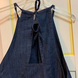 A-line denim dress. Halter, tie back with a cut out look in back. Low arm holes with pockets. Model pictures are stock photos.